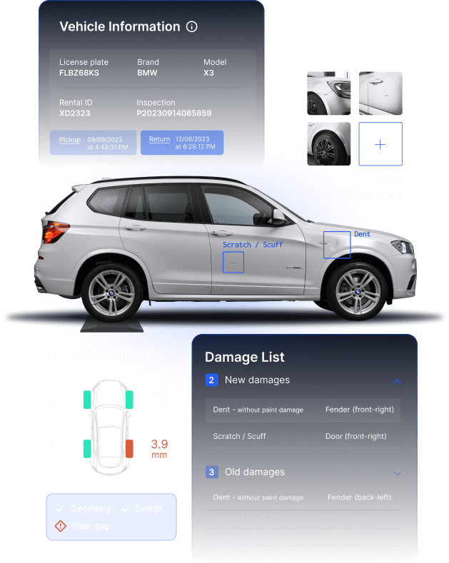 Grâce à notre IA propriétaire, chaque scan génère des insights exploitables : état du véhicule, usure pneus, détection de chocs… — Disponibles dans votre outil ou partagés avec vos clients.